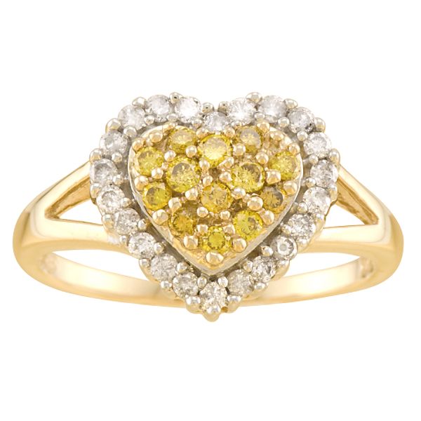 Decorate your hand with the romantic glimmer of this eye-catching ring. Thirty-five round yellow and white diamonds (1/2 cttw) blend beautifully in a framed heart cluster on a polished 10k yellow gold band. Diamond weights may not be exact, but are never more than.05 carats below the stated weight.